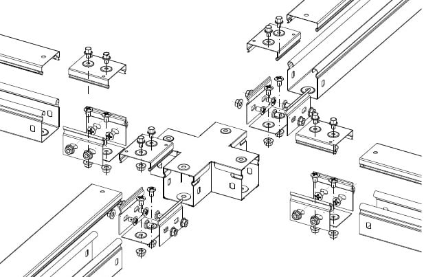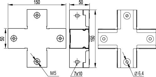 Данный аксессуар имеет Х-образную форму и необходим для организации поворотов и ответвлений в горизонтальной плоскости. Применяется  в особенных случаях, когда, например, лоток используется в качестве настенного кабель-канала, или при обвязке оборудования. Конструкция элемента предотвращает возможное повреждение кабеля. Исполнение - "цинк-ламель". Высота – 50 мм, ширина – 50 мм.