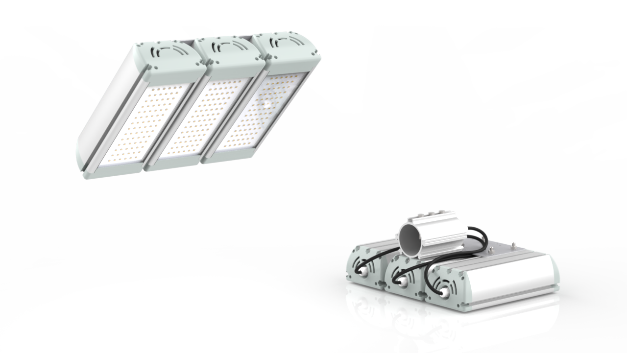 Объединенные светильники серии "Модуль PRO". "Хвосты" питания не объединены в один. Сколько модулей, столько и "хвостов". Модули могут работать независимо друг от друга. Это позволяет включать их различными фазами, а также производить замену Модулей, без демонтажа всего светильника. Опционально заказ объединения "хвостов" в один.