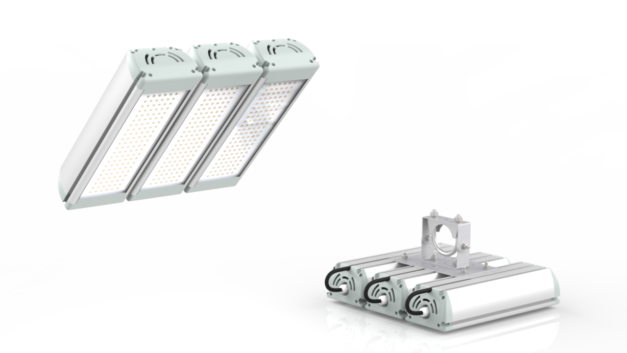 Объединенные светильники серии "Модуль PRO". "Хвосты" питания не объединены в один. Сколько модулей, столько и "хвостов". Модули могут работать независимо друг от друга. Это позволяет включать их различными фазами, а также производить замену Модулей, без демонтажа всего светильника. Опционально заказ объединения "хвостов" в один.